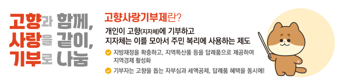 고향사랑기부제란 개인이 현재 주소지를 제외하고 자신의 고향이나 원하는 지방자치단체에 일정액을 기부하여 세액 공제 및 답례품등의 혜택을 받는 제도입니다. 기부 참여는 개인만 가능하며 법인이나 단체 기부는 불가합니다.