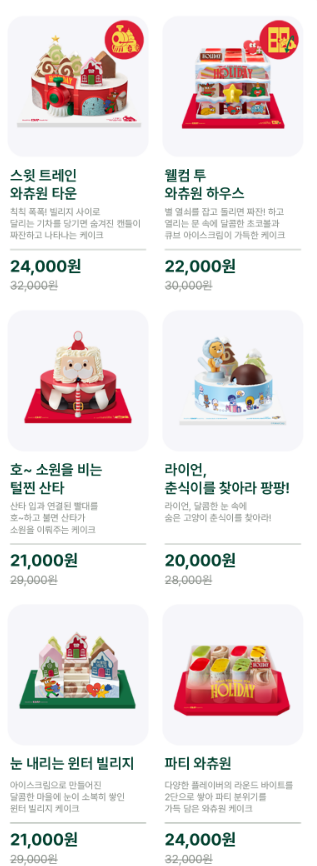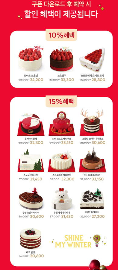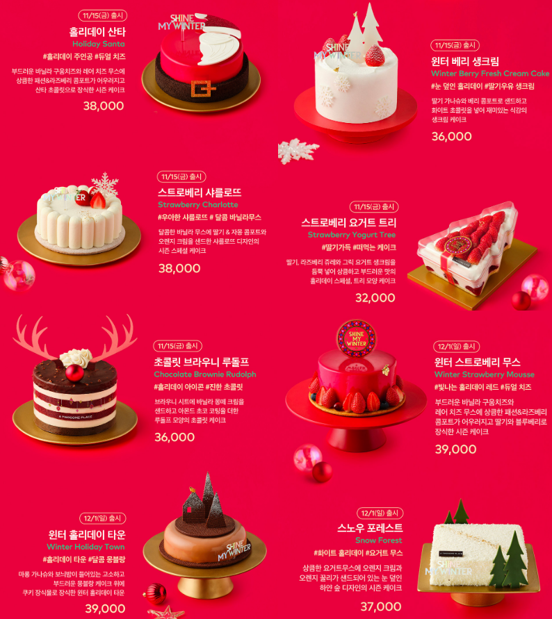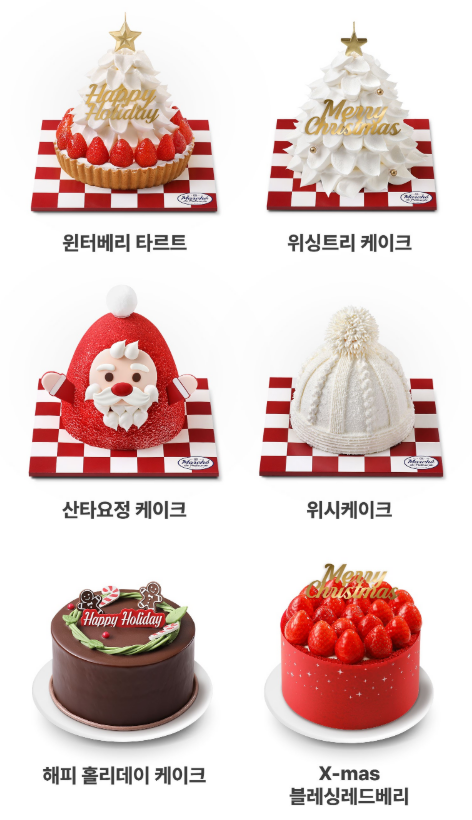 이렇게 어느 것 하나 고르기 힘들 정도로 다양한 크리스마스 케이크들이 선보이는데요. 사전예약 기간이 끝나기 전에 가족, 연인과 함께 보낼 멋진 크리스마스에 어울리는 케이크를 선택해 보는 건 어떨까요?