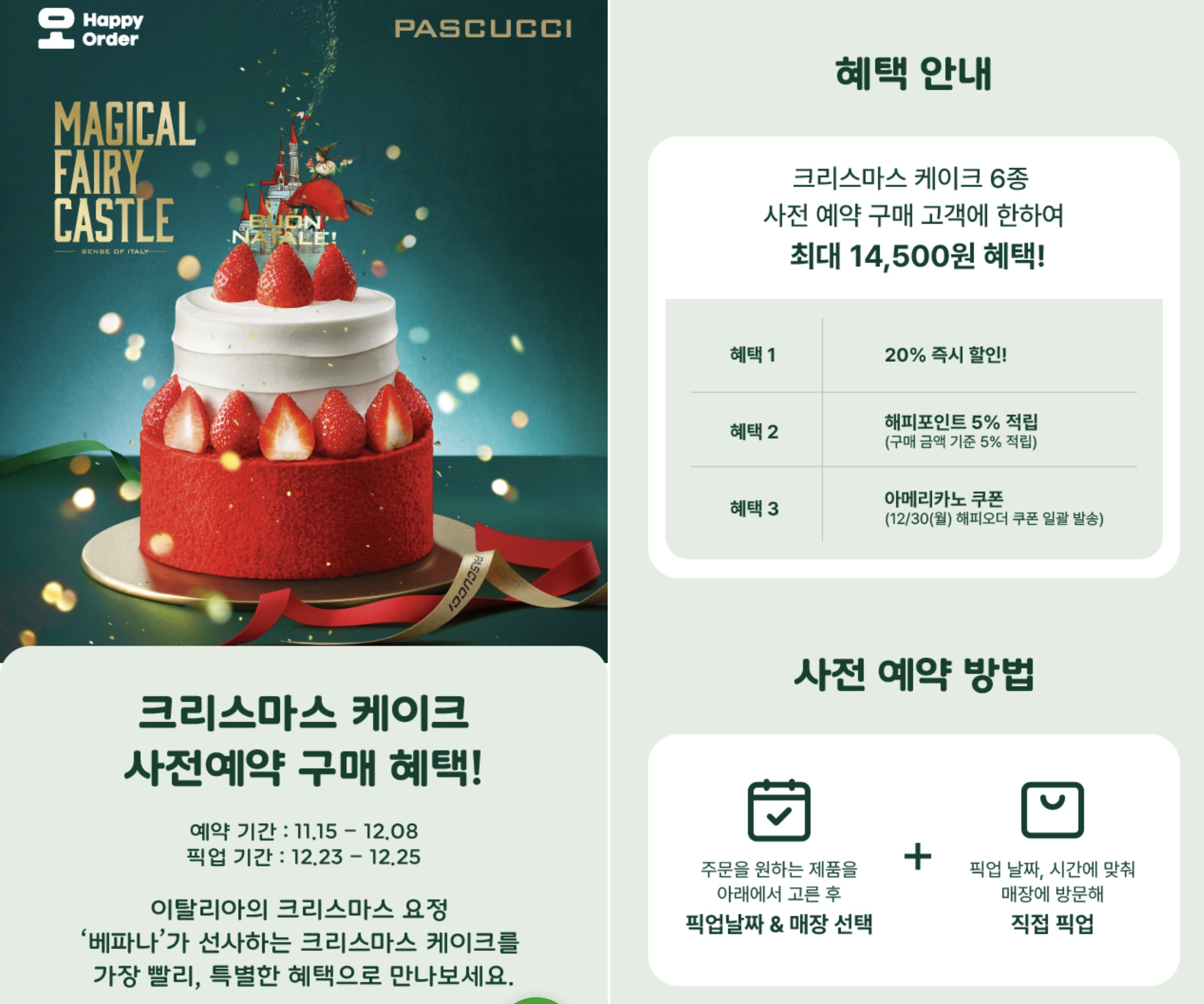 커피전문점 파스쿠찌는 이탈리아의 산타로 불리는 '베파나'를 콘셉트로 삼아, 유명 일러스트 작가 세다트 기르긴과 협업한 제품을 선보입니다. 파스쿠찌는 해피오더 앱을 통해 크리스마스 케이크를 구매하면 최대 14,500원의 혜택을 제공하는 사전 예약 행사도 진행합니다.