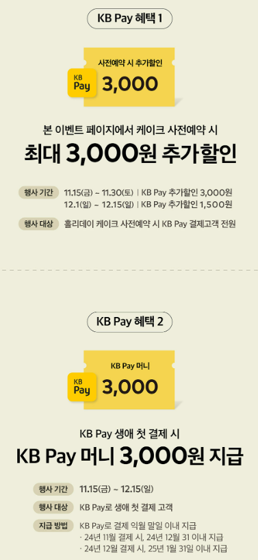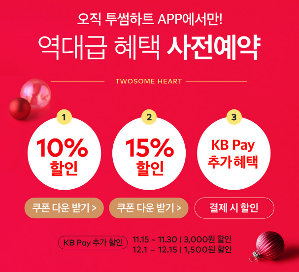 투썸플레이스는 홀리데이 케이크 1차 라인업 출시에 맞춰 자체 앱인 '투썸하트'에서 사전 예약 이벤트를 실시합니다. 사전 예약 시 홀케이크 10~15% 할인 쿠폰을 제공하고, KB Pay 간편 결제를 이용하면 추가 할인 혜택이 주어집니다.