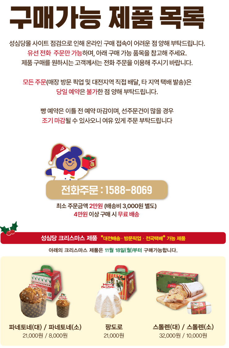 지역 베이커리의 최강자 '성심당'에서도 크리스마스 케이크 사전 예약 일정을 발표했습니다. 대표 상품인 '딸기시루 2.3kg'은 딸기 한 박스를 통째로 넣고 49,000원이라는 가격을 책정했습니다. 다만, 이번에도 '딸기시루' 케이크는 현장 판매만 진행하며, 예약 구매 가능한 케이크도 유선 전화로만 가능합니다.