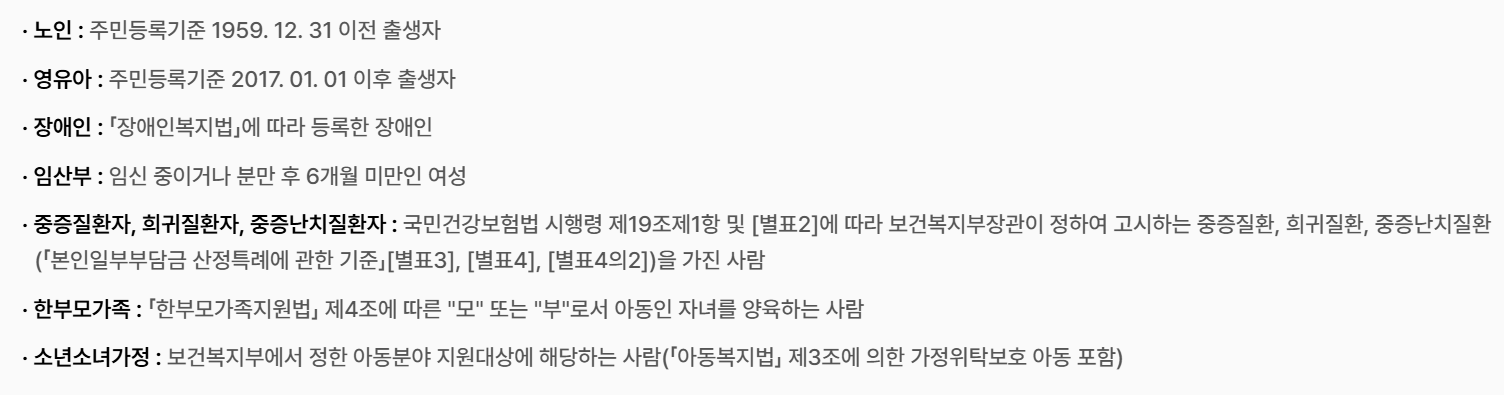 · 「국민기초생활 보장법」에 따른 생계급여 / 의료급여 / 주거급여 / 교육급여 수급자