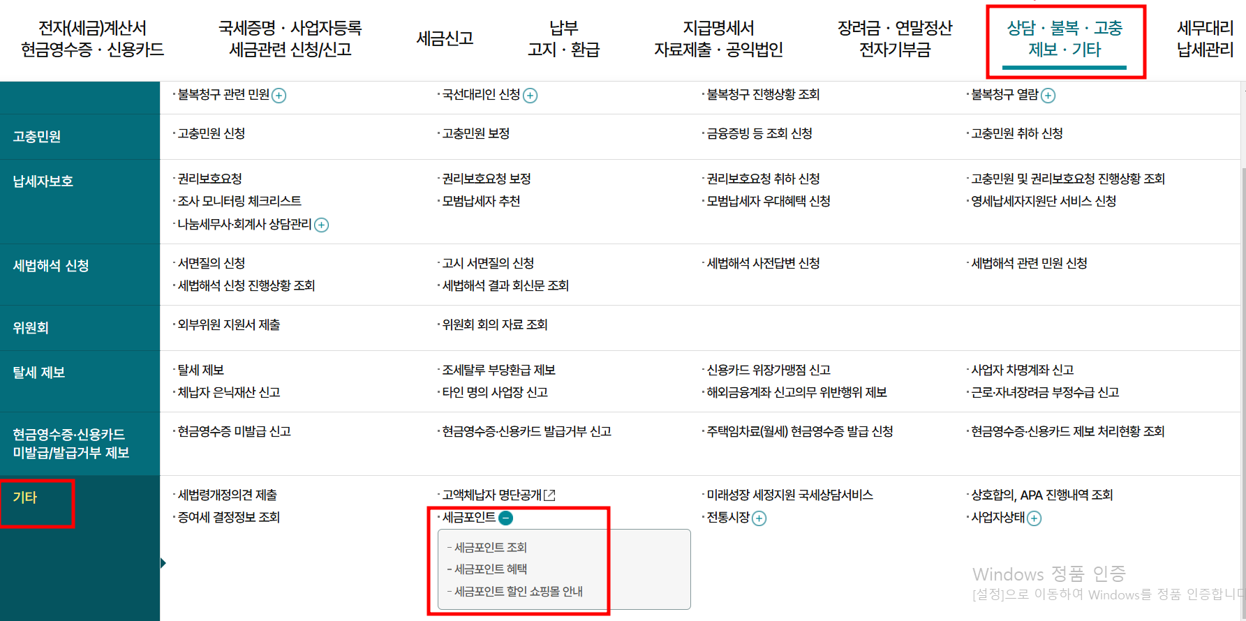 2) 오른쪽 상단 '전체메뉴' > '상담/불복/고충/제보/기타' > 기타 > 세금포인트 조회
