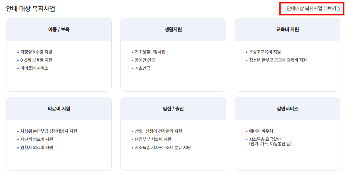 기본적인 안내 대상 복지사업은 아래와 같으며, '안내대상 복지사업 더보기'를 누르시면 더 많은 복지사업에 대해 지역별로 확인하실 수 있습니다.