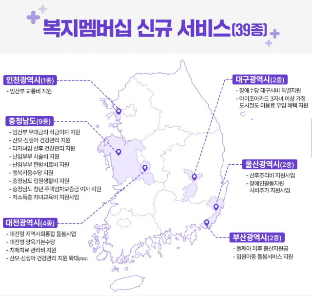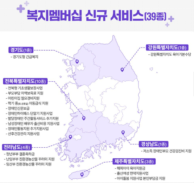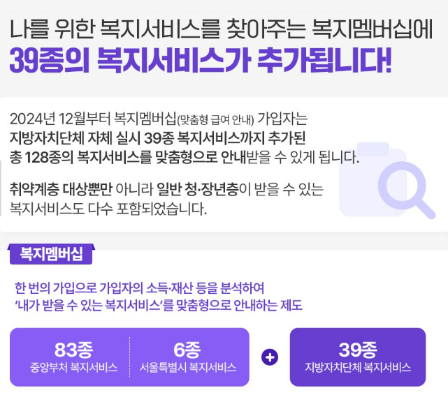 2024년 12월부터 복지멤버십 가입자는 지방자치단체에서 제공하는 39종의 복지서비스가 추가된 총 128종의 맞춤형 복지서비스(중앙부처사업 83종, 지자체사업 45종)를 안내받을 수 있게 됩니다.