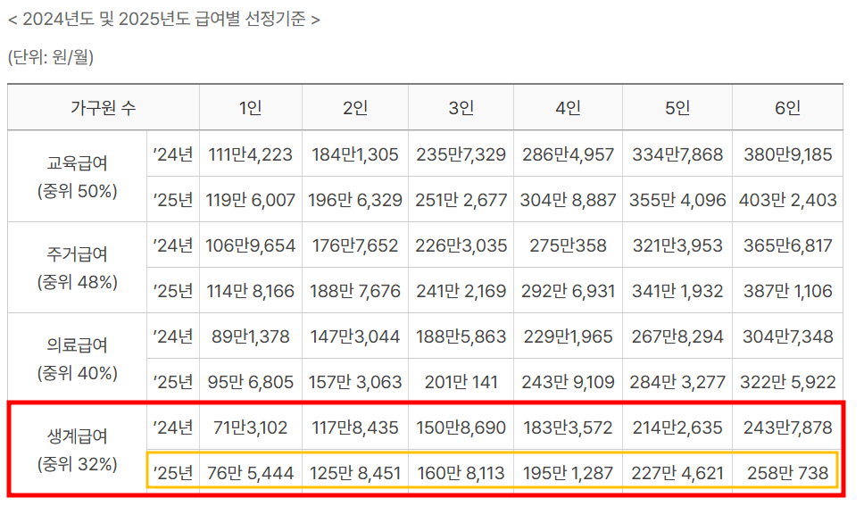 생계급여는 선정기준이 곧 최저보장수준이며 4인 가구 기준으로는 2024년 183만 3,572원에서 2025년 195만 1,287원(6.42%)으로, 1인 가구 기준으로는 2024년 71만 3,102원에서 2025년 76만 5,444원(7.34%)으로 인상됩니다.