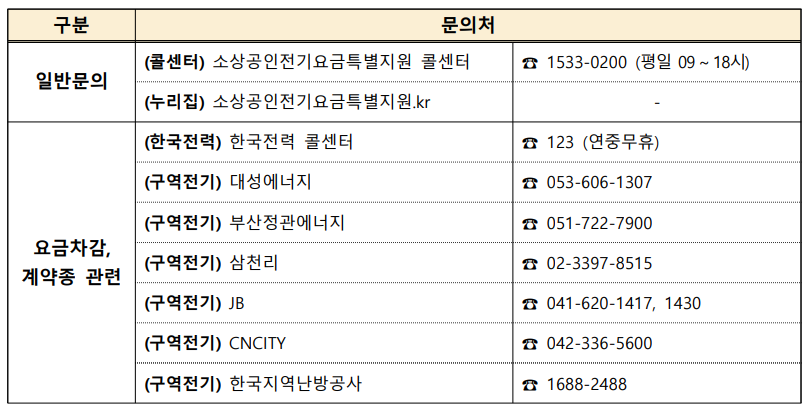 * 전기요금 계약종은 전기요금 고지서에서 확인할 수 있으며, 파악이 어려울 경우 고객번호를 확인하고 한국전력 콜센터(123) 혹은 개별 구역전기사업자에 문의