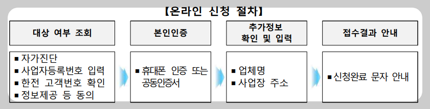1) 온라인 신청 : 포털사이트 검색 또는 주소창에 '소상공인전기요금특별지원.kr' 입력하면 접속 가능