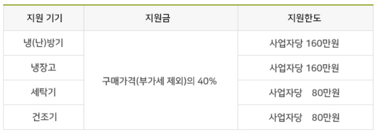 * 예를들어 구매가격이 200만원인 냉방기 3대와 100만원인 세탁기 3대 구매시, 지원금은 총 240만원 지급(=냉방기 160만원+세탁기 80만원)