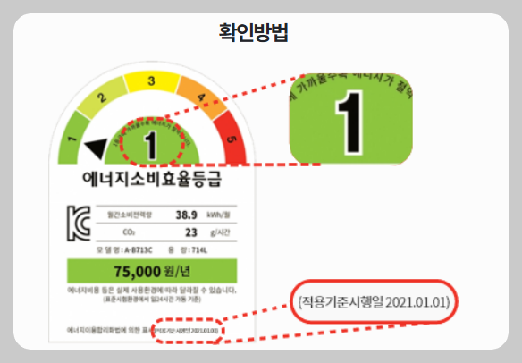 3) 에너지효율등급 라벨 : 구매한 신규기기의 에너지효율등급을 확인할 수 있는 라벨