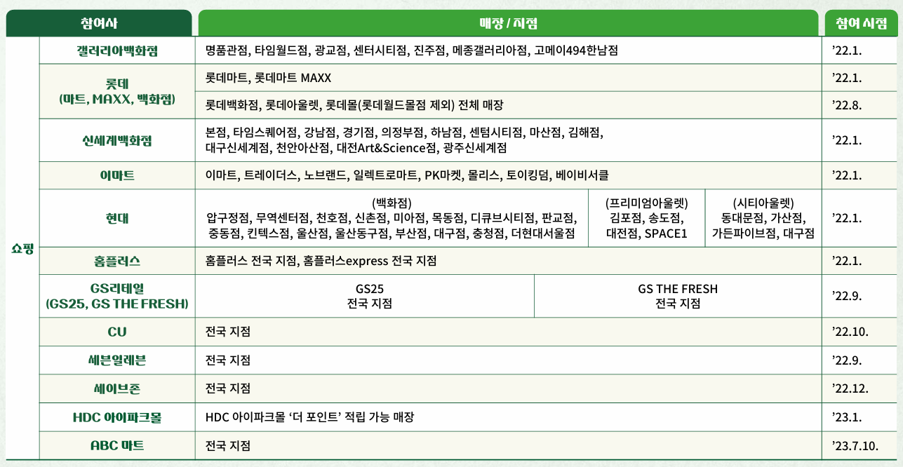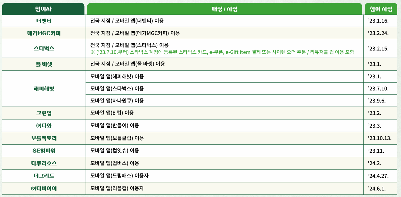 그 외 일회용컵 반환, 리필스테이션 이용, 다회용기 이용, 무공해차 대여, 친환경제품 구매, 고품질 재활용품 배출, 폐휴대폰 반납과 관련한 참여 업체 현황이 궁금한 분들은 아래 배너를 참고하시기 바랍니다.