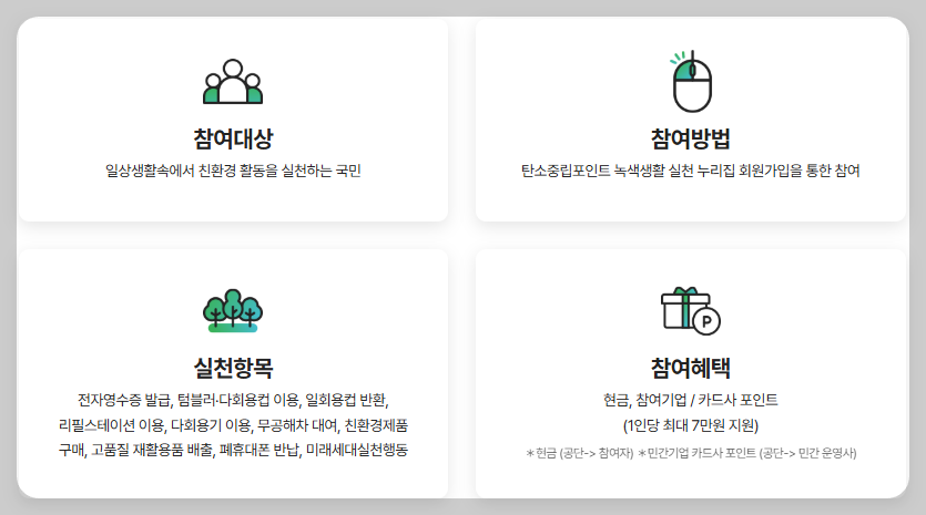 일반국민의 탄소중립 생활 실천문화 확산을 위하여 다양한 민간기업의 친환경 활동 이용시 이용실적에 따라 인센티브를 지원하는 제도입니다.