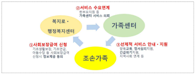 1) 생계 ·의료 ·주거 급여 등 사회보장서비스를 신청하는 조손가족의 정보를 가족센터에 연계, 관련 서비스 안내 및 상담 실시