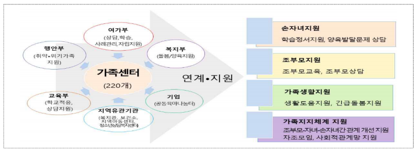 4) 지역 내 유관기관에서 위기 조손가족 발굴 시 가족센터 연계를 통해 통합적으로 필요 서비스 제공