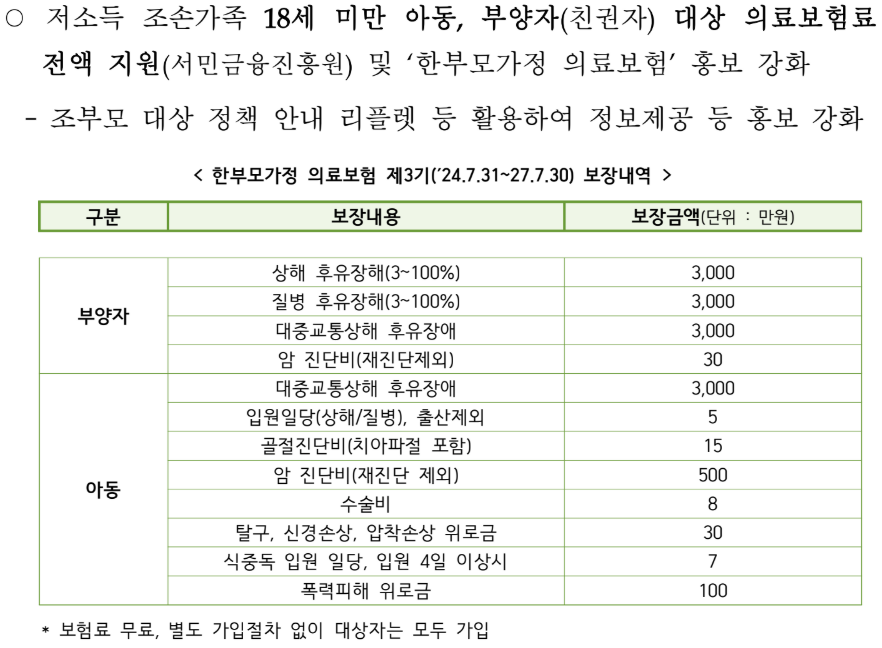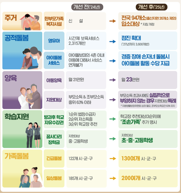 - 한부모가족복지시설 입소대상에 조손가족 포함토록 지침개정('25.1월~) 및 조손가족의 아이돌봄서비스 등 자녀양육 지원·상담 등 지원