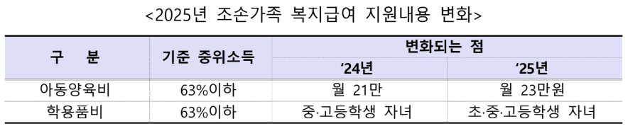 ○ 저소득 조손가족의 자녀 양육비용 부담 수준을 고려하여 아동양육비 지원 단가 상향 (2024년 월 21만 원→ 2025년 월 23만 원) 및 조손가족 자녀 학용품비 지원대상 확대