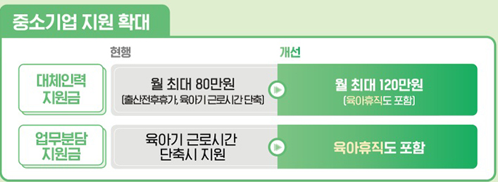 또한 중소기업의 부담을 덜어주기 위해 출산휴가, 육아기 근로시간 단축뿐만 아니라 육아휴직으로 자리를 비운 경우에도 대체인력 지원금을 지원하고, 육아휴직에 대한 업무분담 지원금도 신설합니다.