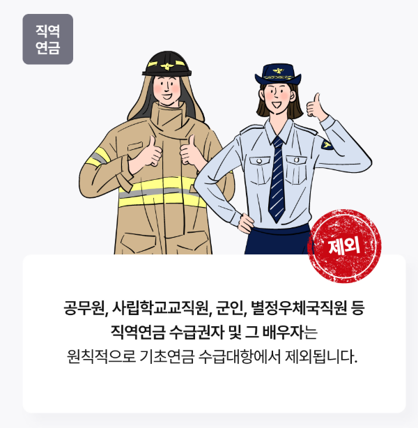 ** 공무원연금, 사립학교교직원연금, 군인연금, 별정우체국연금 수급권자 및 그 배우자는 원칙적으로 기초연금 수급대상에서 제외됩니다.