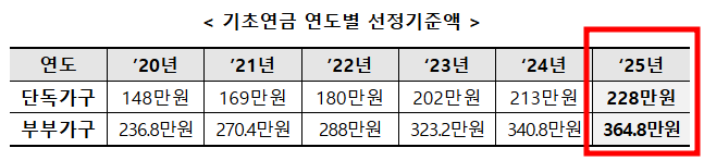 최근 보건복지부에서는 2025년도 기초연금 선정기준액을 단독가구 월 228만 원, 부부가구 월 364만 8,000원으로 결정한다고 밝혔습니다. 노인가구별 월 소득인정액이 해당 선정기준액 이하이면 기초연금을 받을 수 있게됩니다.