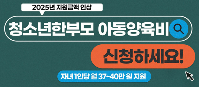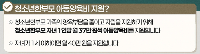 - 청소년 한부모 가족의 양육부담을 줄이고 자립을 지원하기 위해 청소년 한부모 자녀 1인당 월 37만 원씩 아동양육비를 지원합니다.