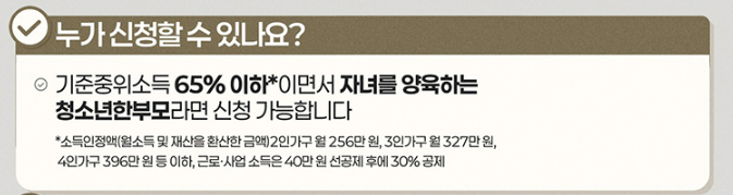 - 기준중위소득 65% 이하*이면서 자녀를 양육하는 청소년 한부모라면 신청 가능합니다.
