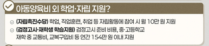 - 학업, 직업훈련, 취업 등 자립활동에 참여 시 월 10만 원 지원