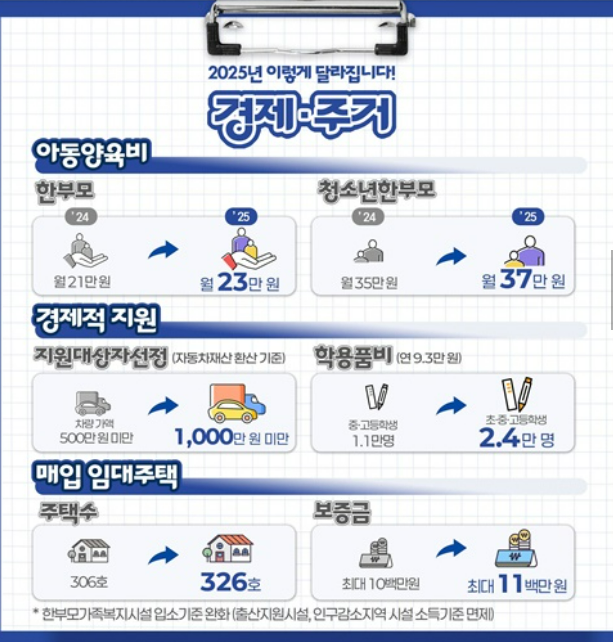 2025년 여성가족부는 한부모가족의 안정적인 일상을 위해 양육비 선지급제를 시행하고, 아동양육비와 주거 지원 등을 강화하는 정책을 발표했습니다.