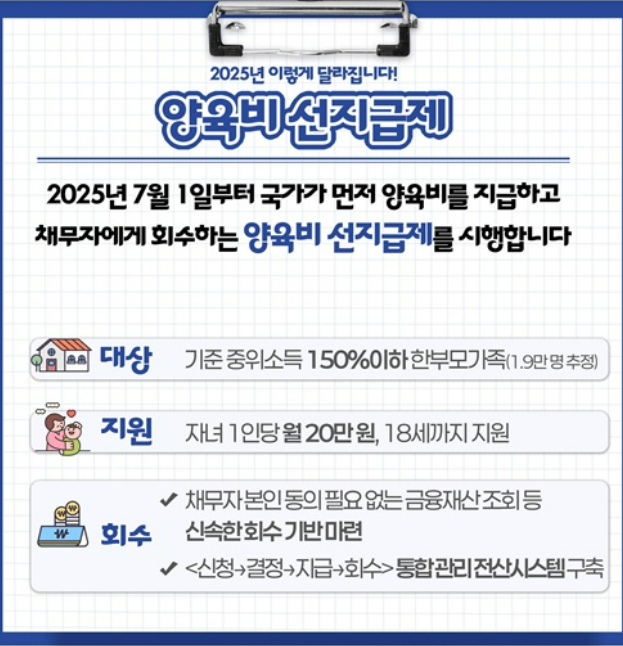 2025년 7월 1일부터 국가가 먼저 양육비를 지급하고 채무자에게 회수하는 양육비 선지급제를 시행합니다.